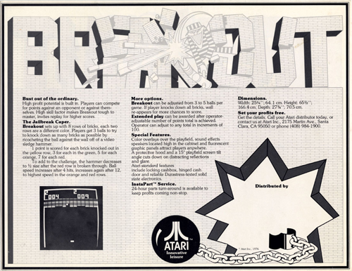 이전 글에서 최초의 전자 게임인 pong을 높이 평가한 이유는, 단순하지만 컴퓨터를 매개로 사람과 사람 사이의 대전 방식이라는 점 때문이었습니다. 혼자서 놀지 않고 같이 놀 수 있는, 이 얼마나 즐거운 광경입니까? 그런데 그 당시에는 이러한 현상이 장점이라기 보다 단점으로 더 크게 보였나 봅니다. 바로 '혼자서 즐길 수 없다'는 점입니다. 그래서 곧 퐁의 변형판 제작이 시작되었는데 그것이 바로 우리가 '벽돌 깨기'라고 부르는 Break Out입니다. 혼자서도 흥미를 잃지 않으려면 심리적인 보상 효과가 필요했겠죠? 아타리의 기술자들은 '상대가 없는 대신 공이 날아가 벽돌 담을 허물어뜨린다'는 아이디어를 채택하게 됩니다. 그리하여 완성된 게임이 '탈옥'을 의미하는 브레이크 아웃인 것입니다. 당시 홍보에 사용된 이미지에도 탈옥을 코믹하게 표현한 카툰이 사용되었네요.